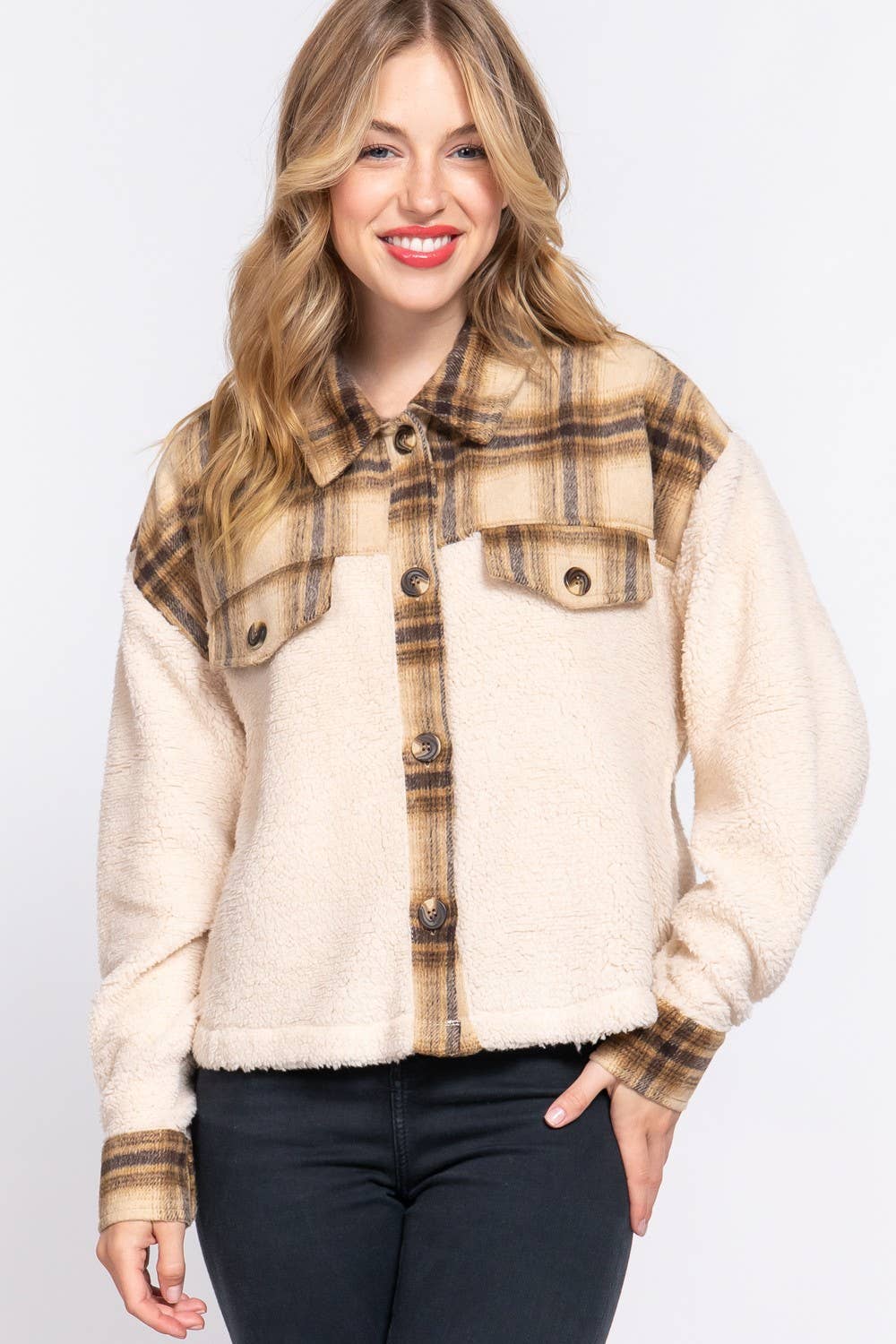 Button Down Plaid Contrast Faux Fur Jacket