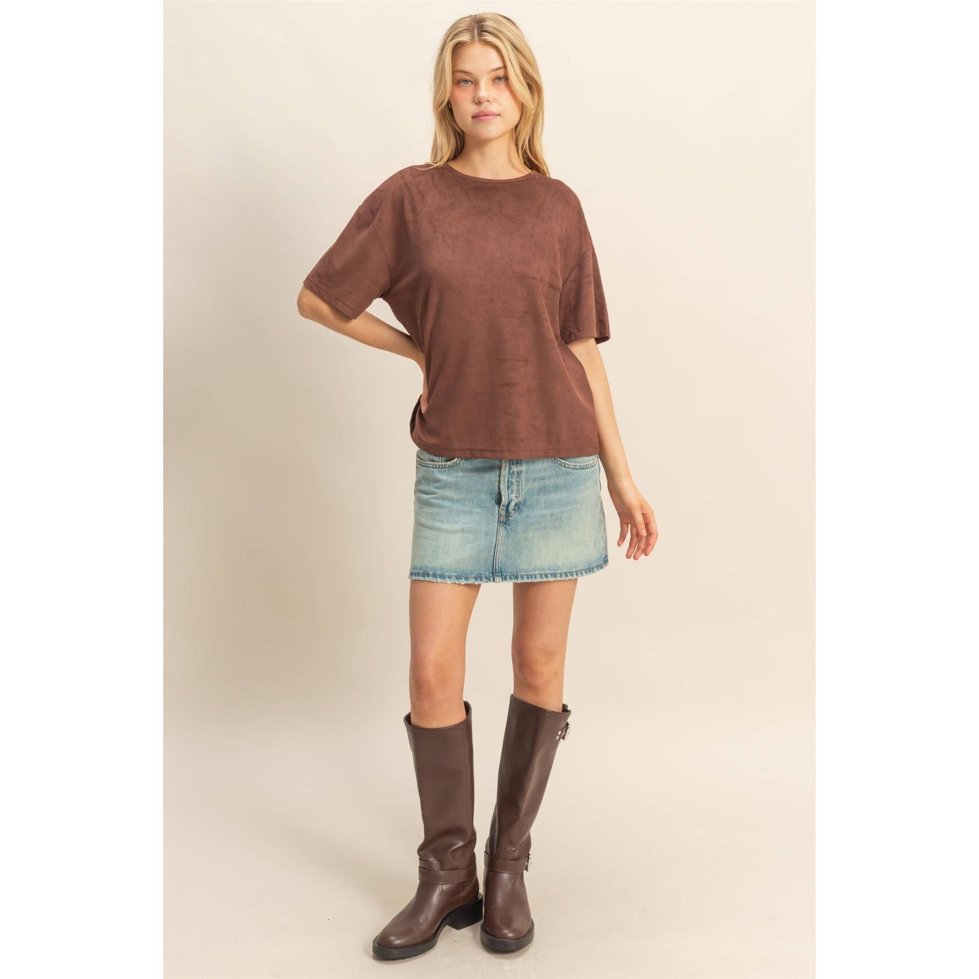 Introducing an effortlessly stylish suede t-shirt, perfect for those seeking both comfort and style. This silhouette ensures a relaxed fit and adds a touch of modern chic, making it a stand-out choice for casual outings. 93% Polyester 7% Spandex