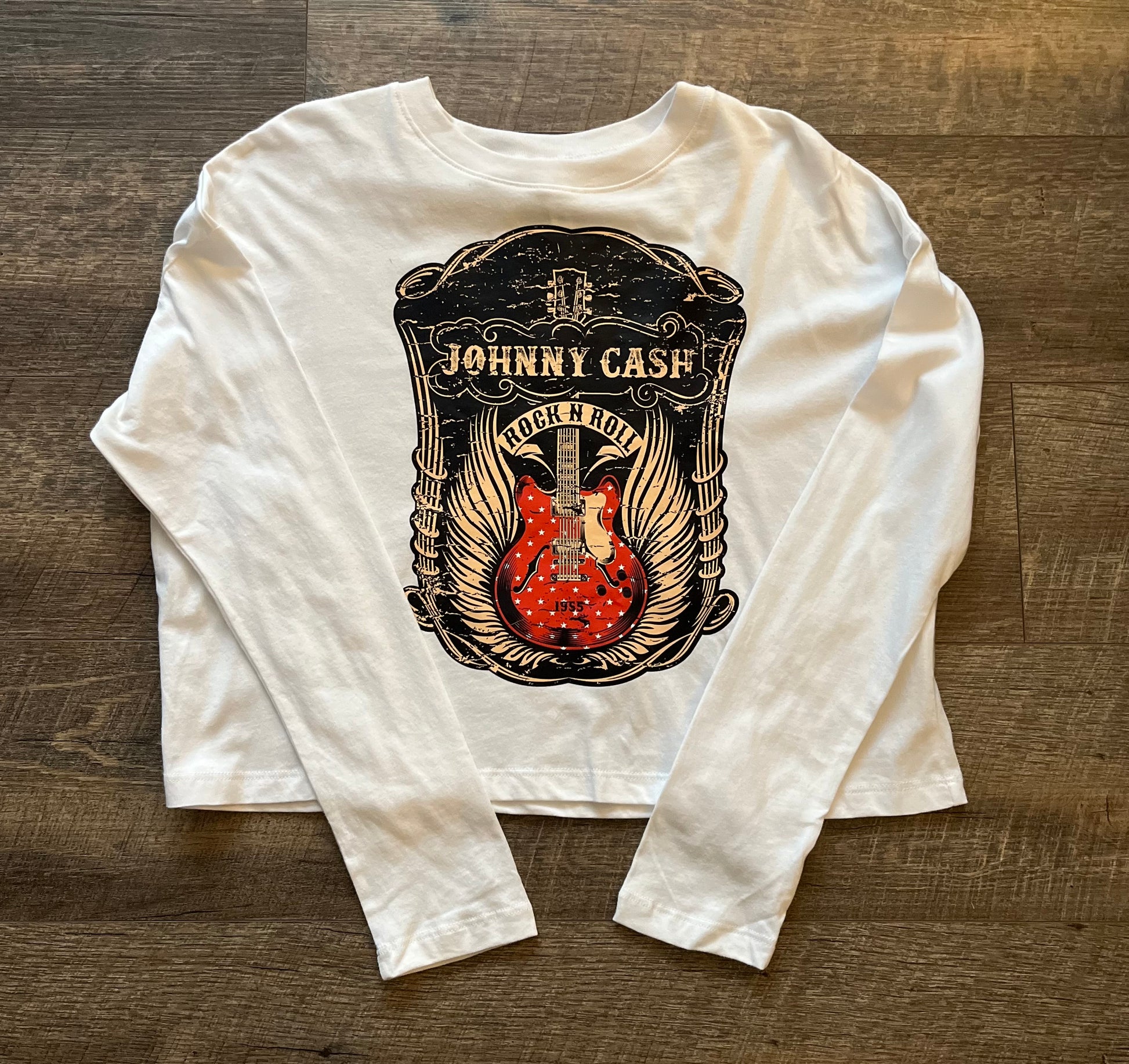 Get your country music on with this Johnny Cash long sleeve crop tee. Perfect for any fan of the Man in Black, this crop tee combines style and comfort in one. Whether you're hitting the town or relaxing at home, this tee has got you covered. 100% Cotton (GCA Original)