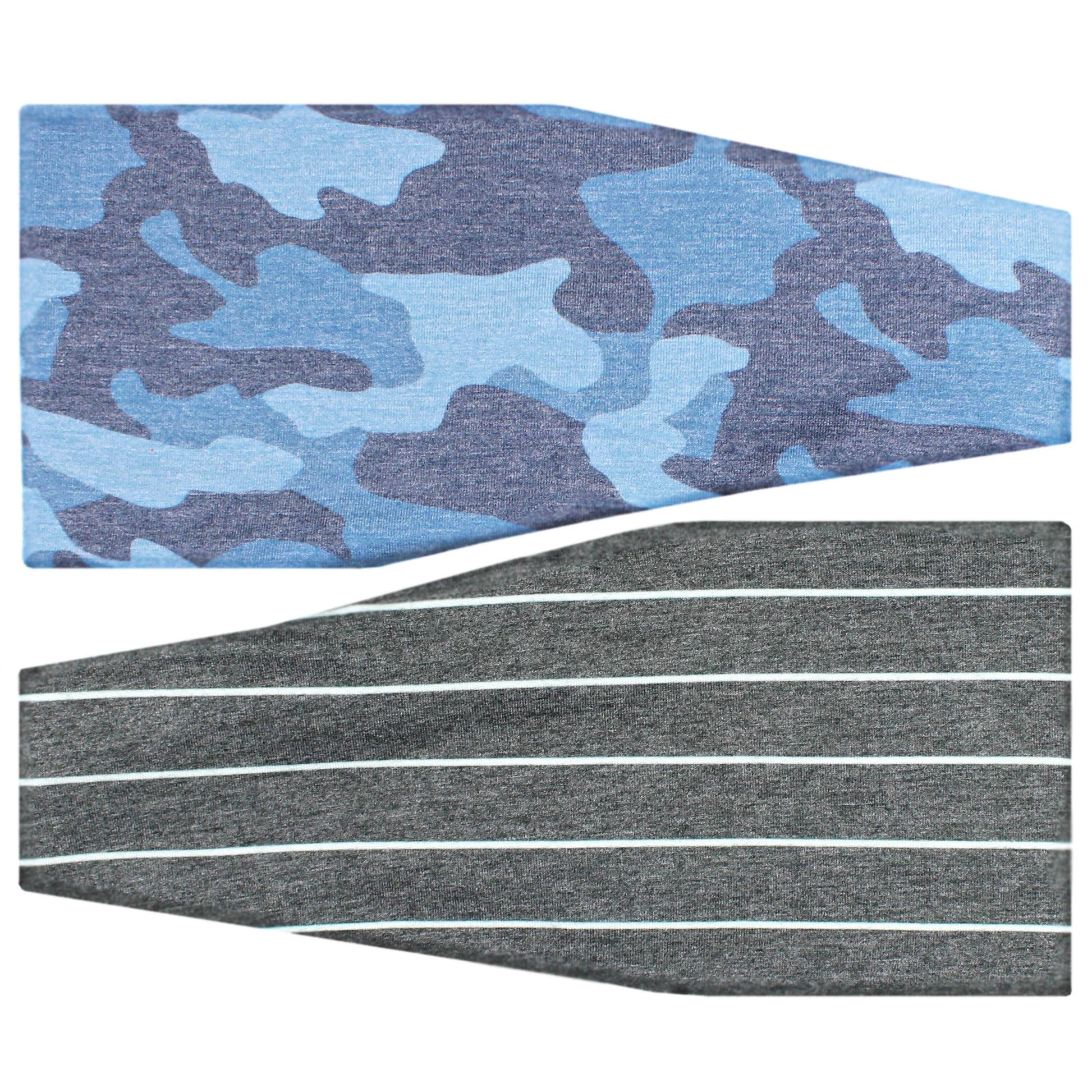 Slightly looser fit 4" headband in blue camo, gray striped, gray camo, or smokey gray . Perfect for those who prefer a slightly looser fit. Polyester, Rayon, Spandex Blend. Sweat-wicking, 4-way stretch, comfortable for all-day use. For use while running, lifting weights, cross fit, yoga, lounging, sports, or any athletic activity.