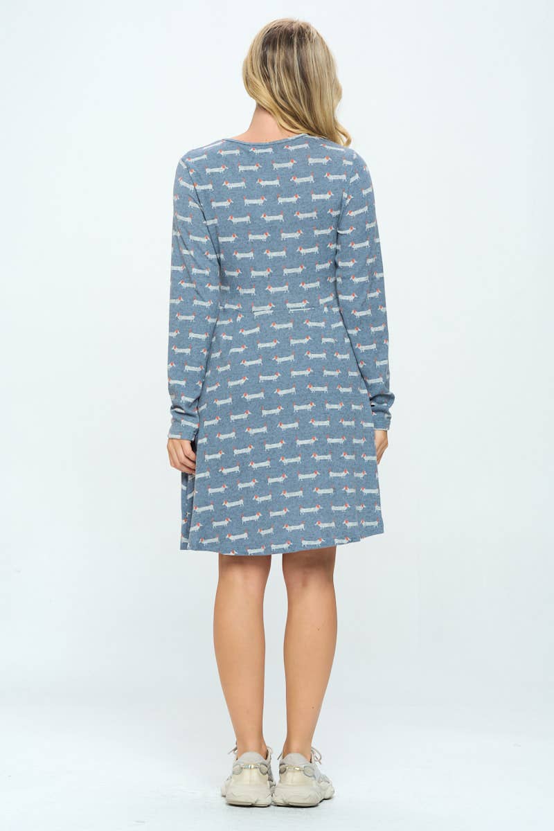 Unleash your inner dog lover with this quirky weiner dog print dress! Made with a flattering tunic dress design and adorned with adorable wiener dogs, this dress is perfect for any fun-loving fashionista. Show off your love for pups in style! This crew neck style dress features soft, comfortable fabric and pockets. 95% Polyester 5% Spandex (Smaller fit)