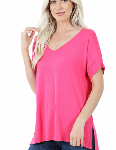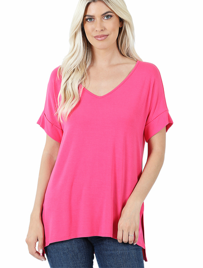 Elevate your wardrobe with this Zenana short sleeve v-neck top! The side slit detail adds a touch of style to the classic v-neck design. Look and feel effortlessly chic and confident wherever you go. Upgrade your casual wear and stand out in the crowd with this versatile top! 95% Modal 5% Spandex