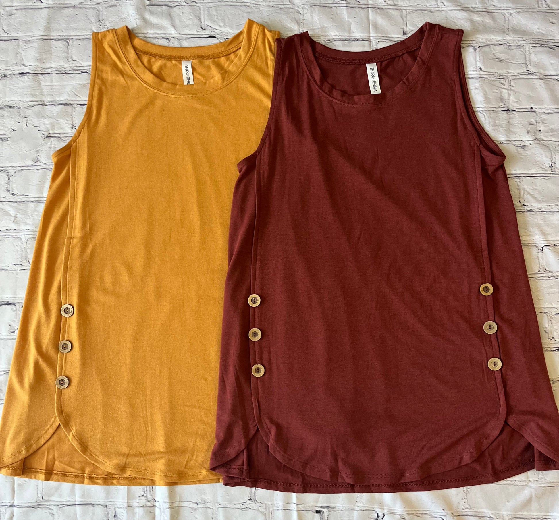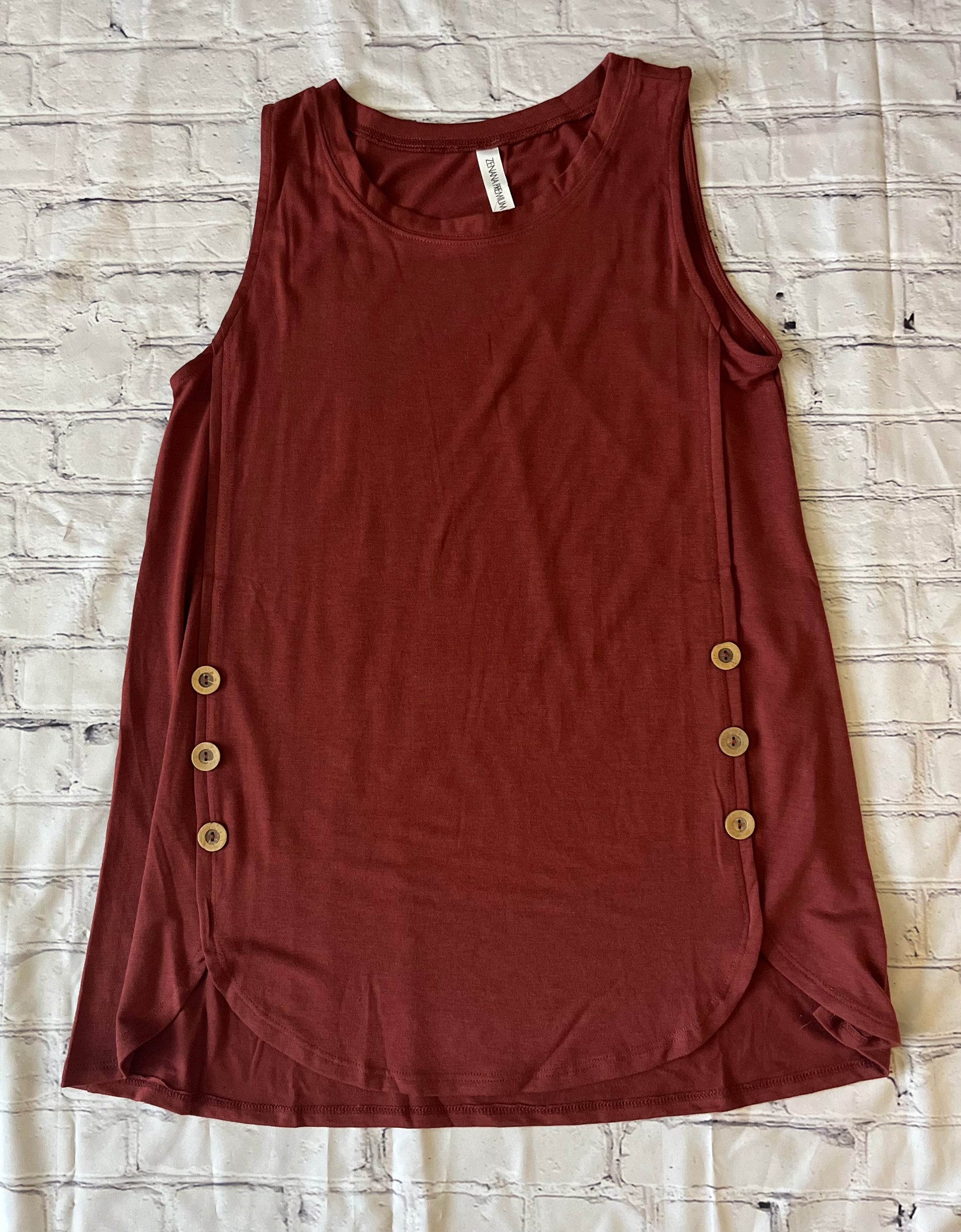 Zenana Sleeveless Wood Buttons Dolphin Hem Top (2 Colors)